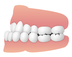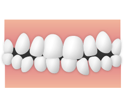 歯が生える場所が足りないなどが原因で、歯がでこぼこに生えている状態のことです。「八重歯(やえば)」も叢生の一種です。また、歯が正面を向かずにねじれて生えている「捻転」もあります。 学校保健法での判断基準は、2本の歯が4分の1以上重なり合うものとされています。